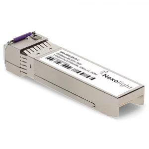 Le module Nexolight SFP28 25GBASE-BX10 assure des liaisons jusqu’à 10 km sur fibre monomode OS2 (SMF) via un connecteur LC simplex, permettant une transmission bidirectionnelle sur une seule fibre.